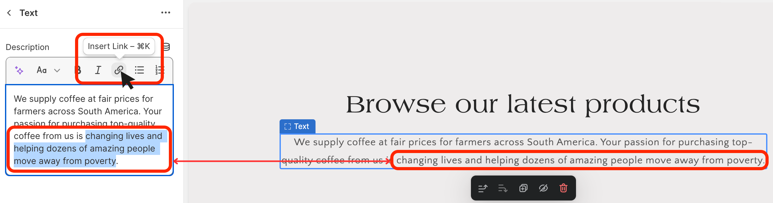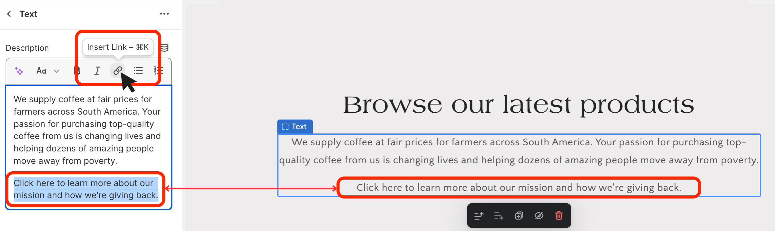 Step 3: Highlight the desired text and click the Insert Link button in the section's options.