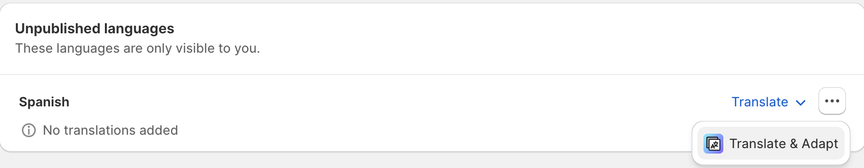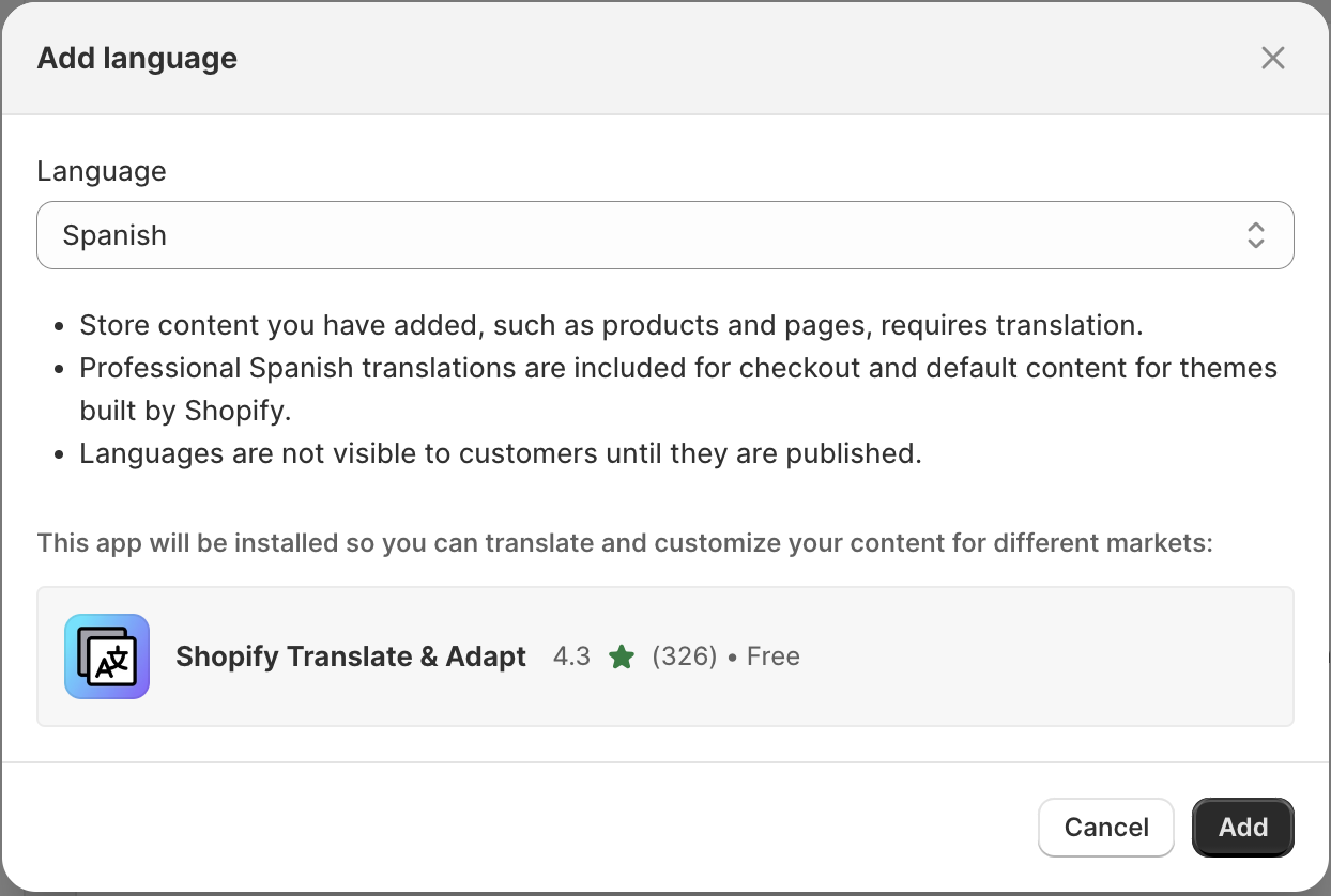 Step 4: Click Add to add the unpublished language to your Shopify admin.