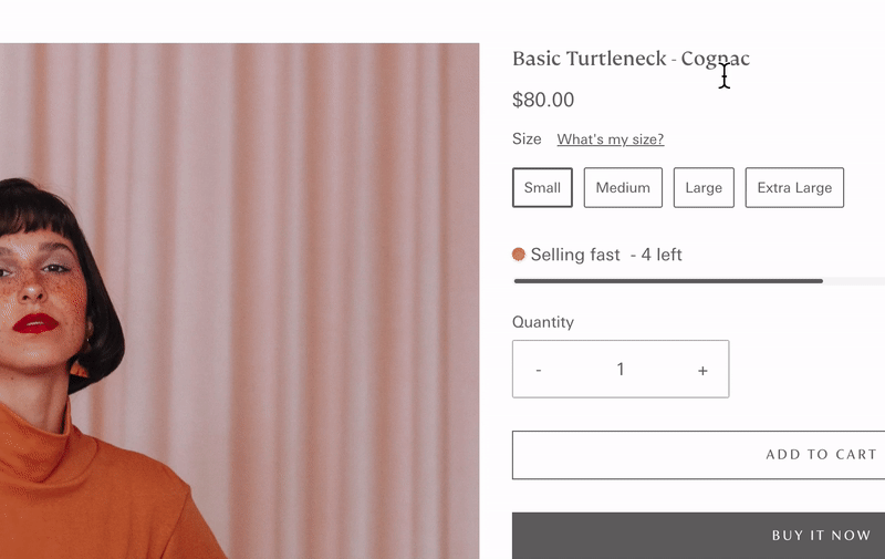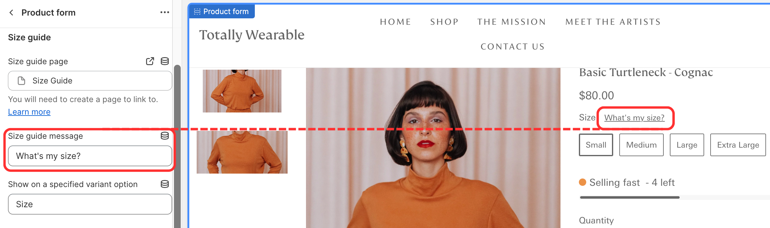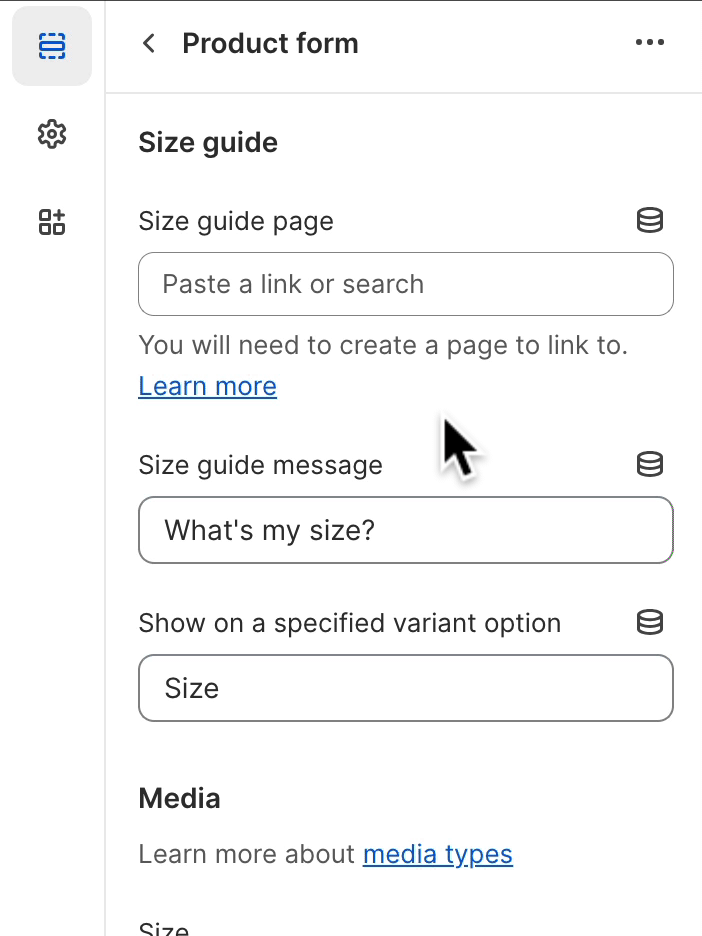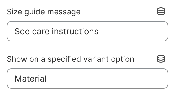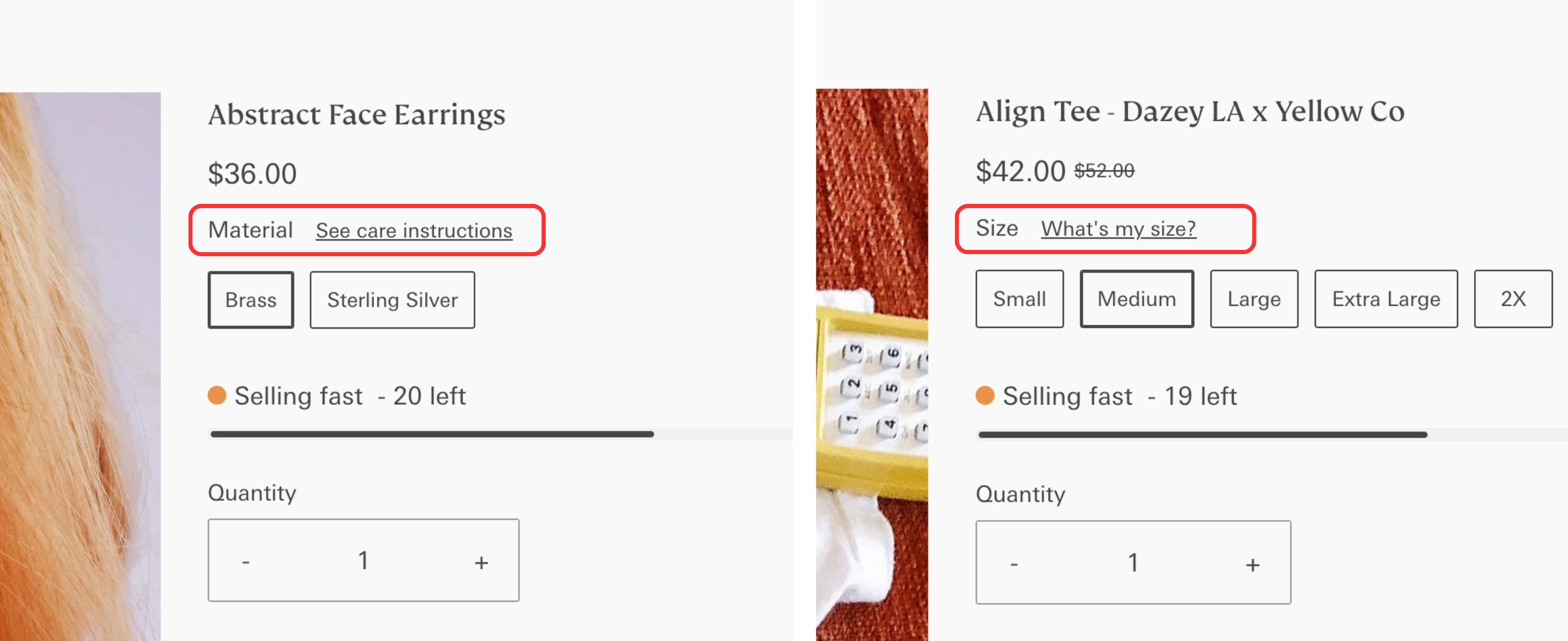 Tip: This size guide link is a versatile tool that isn't limited to showing sizes. A link can be displayed next to any variant type and used to communicate additional product information, such as return instructions, color references, terms and conditions, or materials. Utilize this feature in any way that benefits your customers!