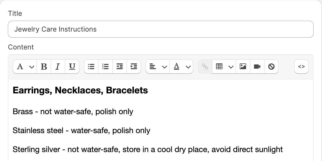 Step 1: Follow the above steps to add a new page to your store and enter the size measurements or other product information into the page's Content area.