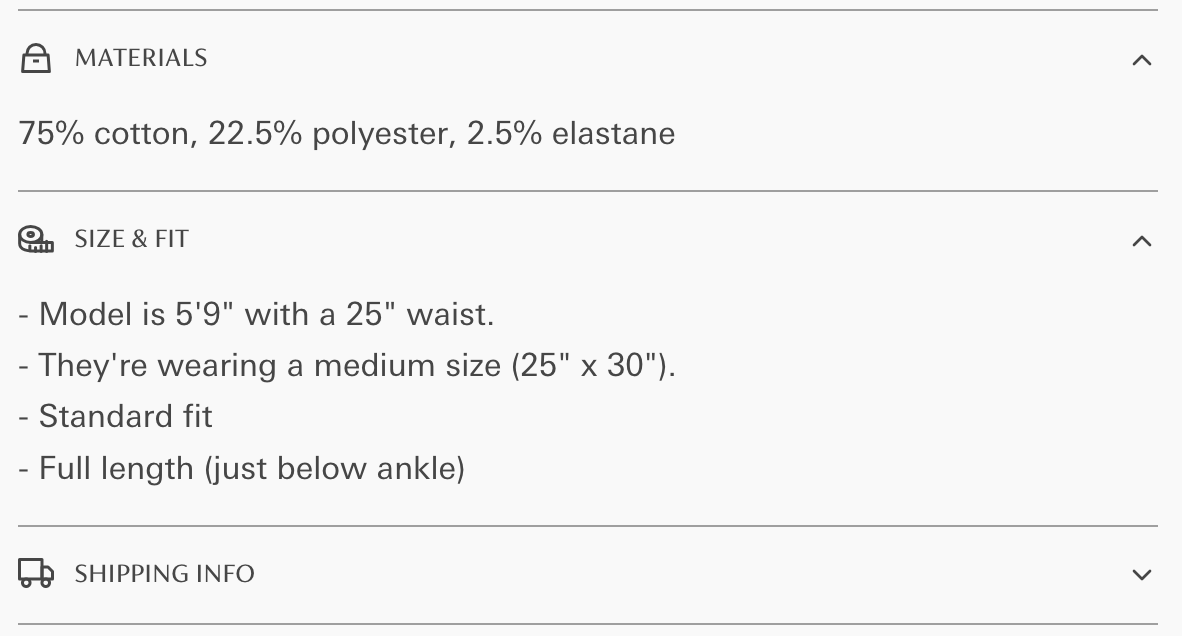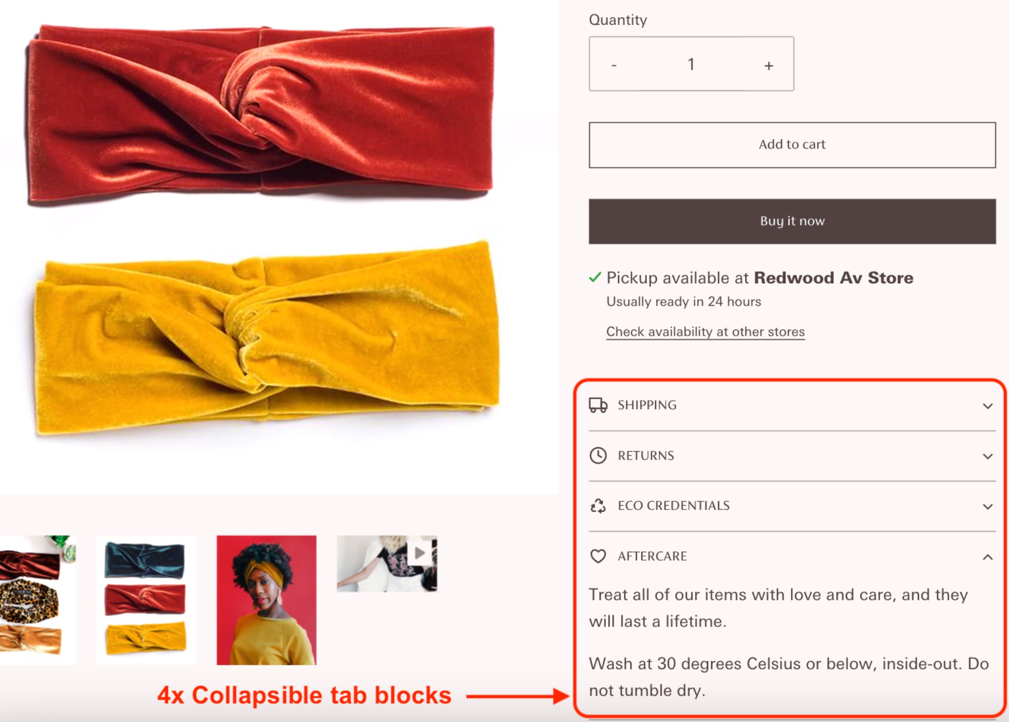 They help you present a lot of product details in a compact space without overwhelming customers. For example, you can use these to communicate delivery times, specifications, materials, and product care advice.