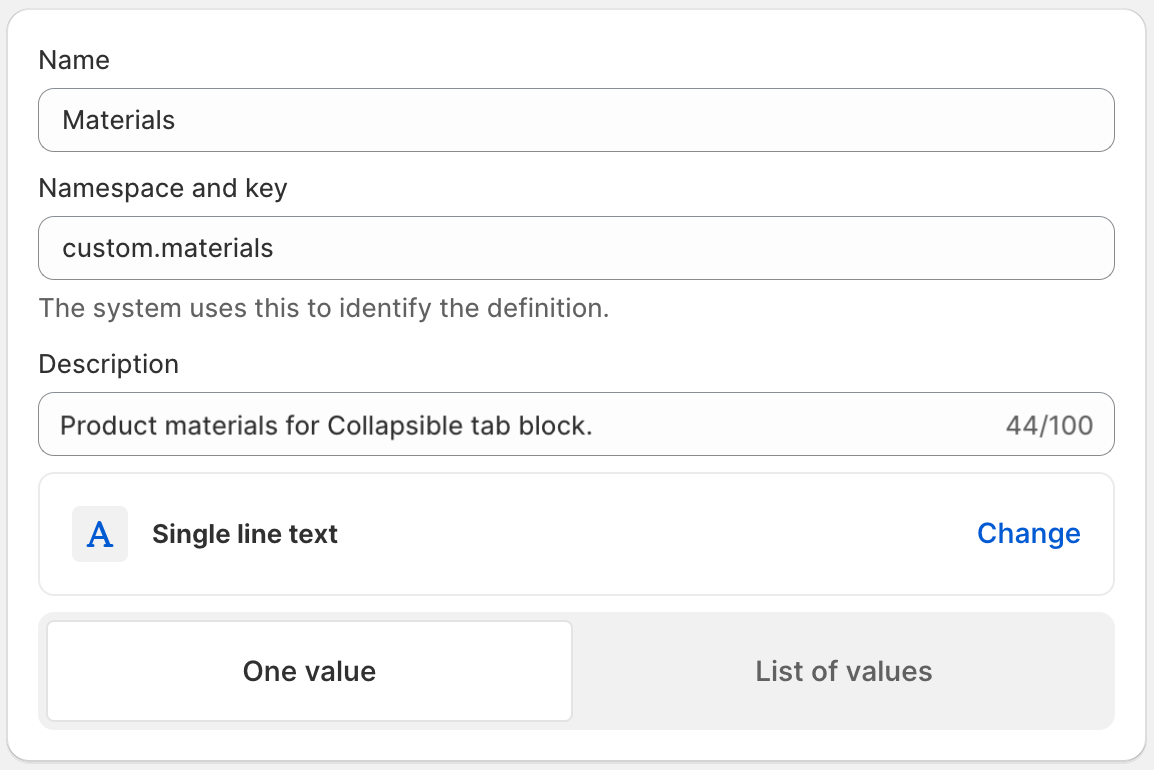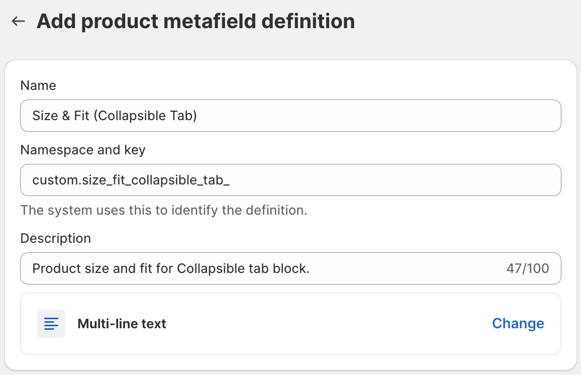 To display bespoke product information in a Collapsible tab block using a metafield, you must first set up the metafield in your Shopify admin.