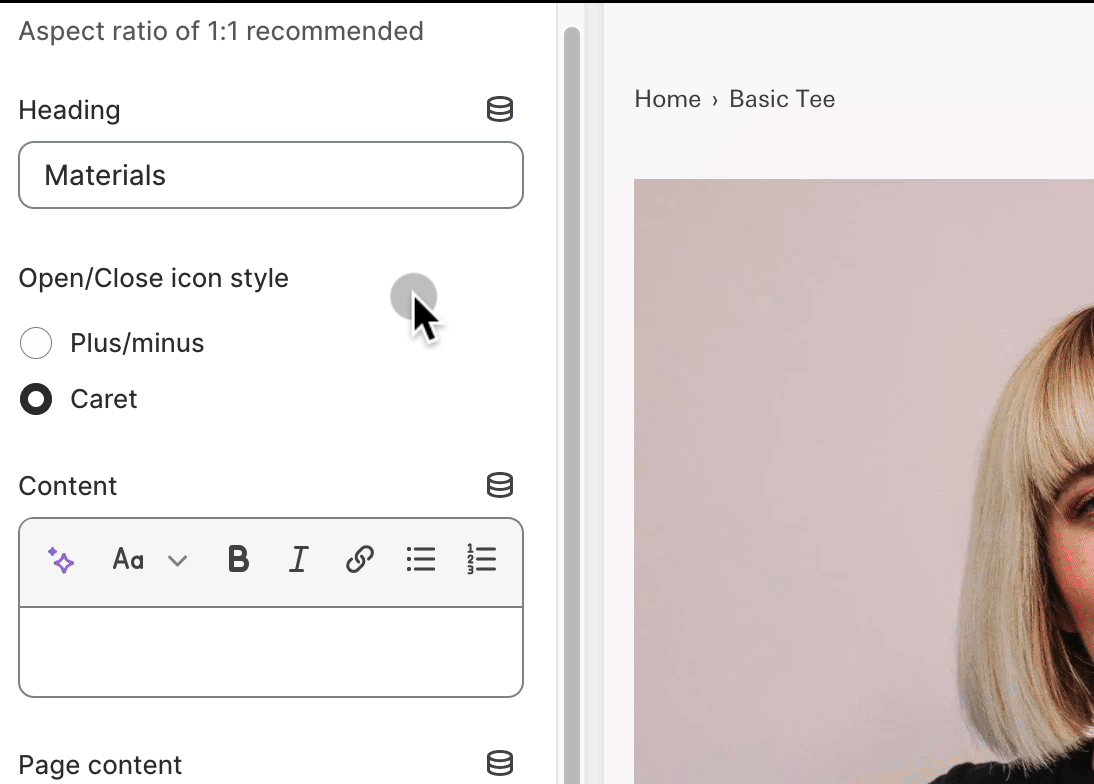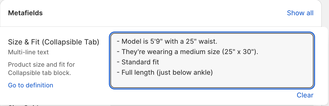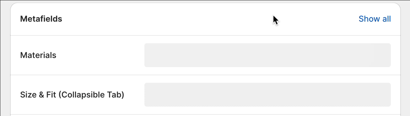 Tip: If some products don't require metafields or Collapsible tabs, we highly recommend creating a new product template to separate them. Consider having one template for products that use Collapsible tabs with metafields and another for products that don't.