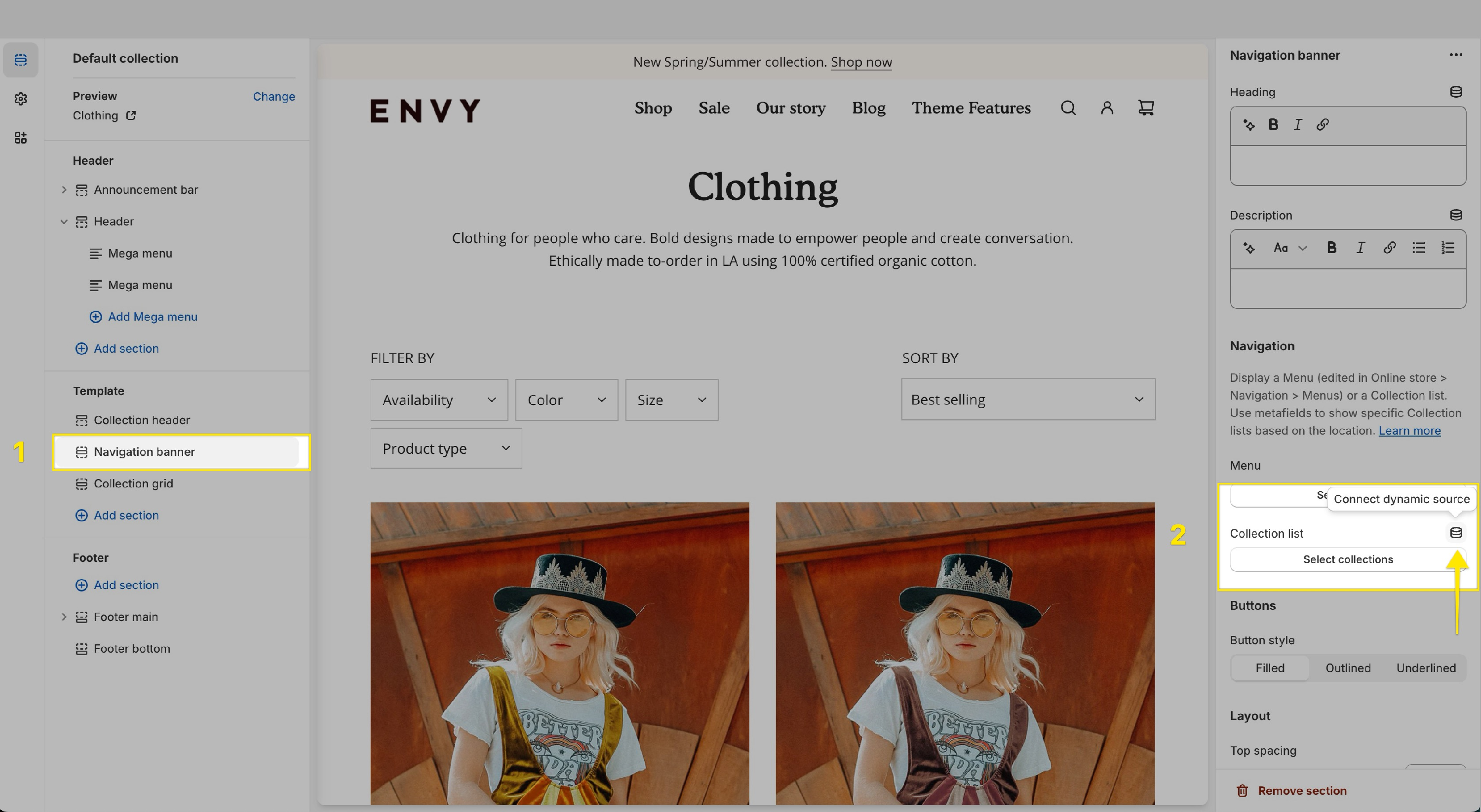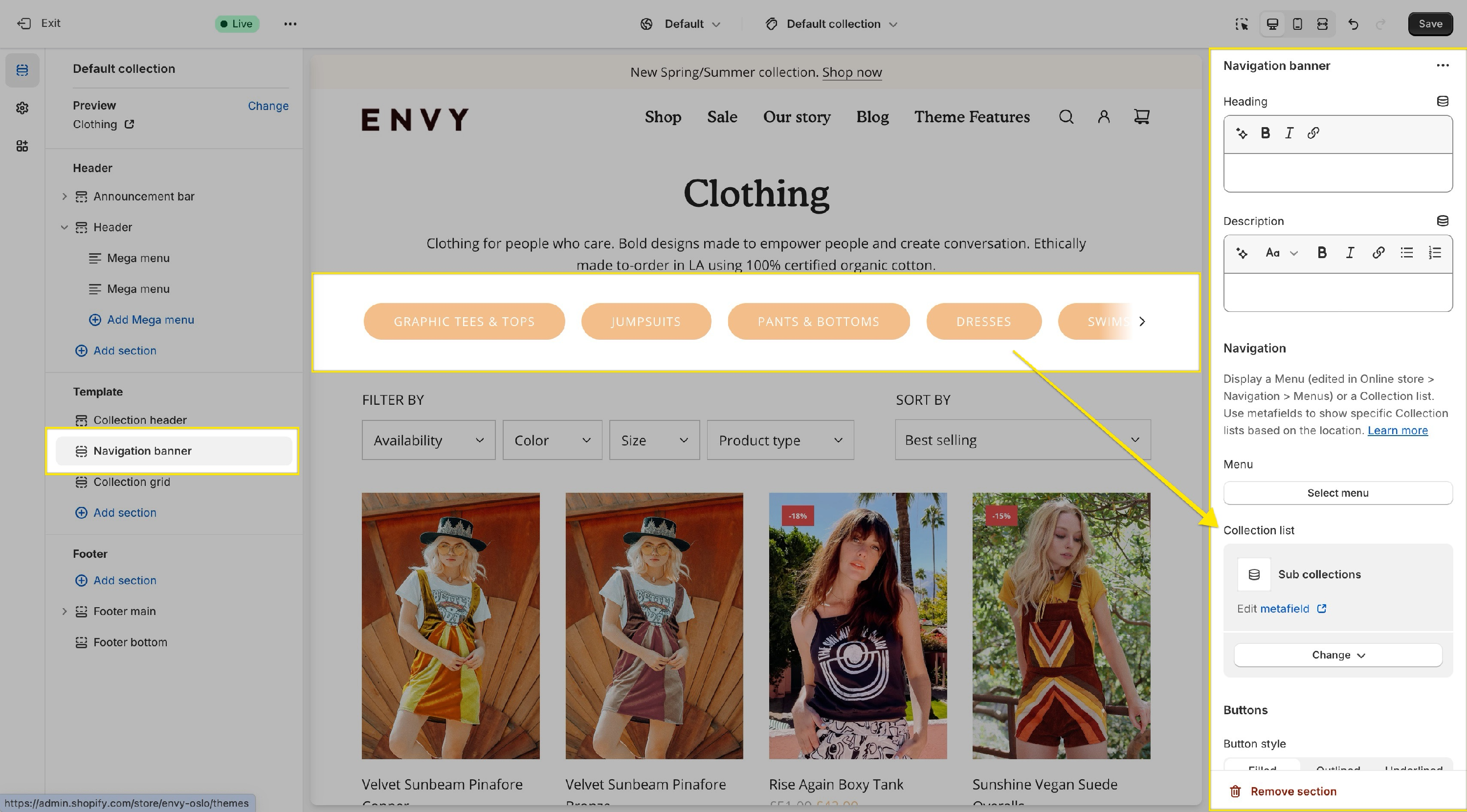 - Once in the theme editor, navigate to the Collection template where you’d like to add the navigation banner.