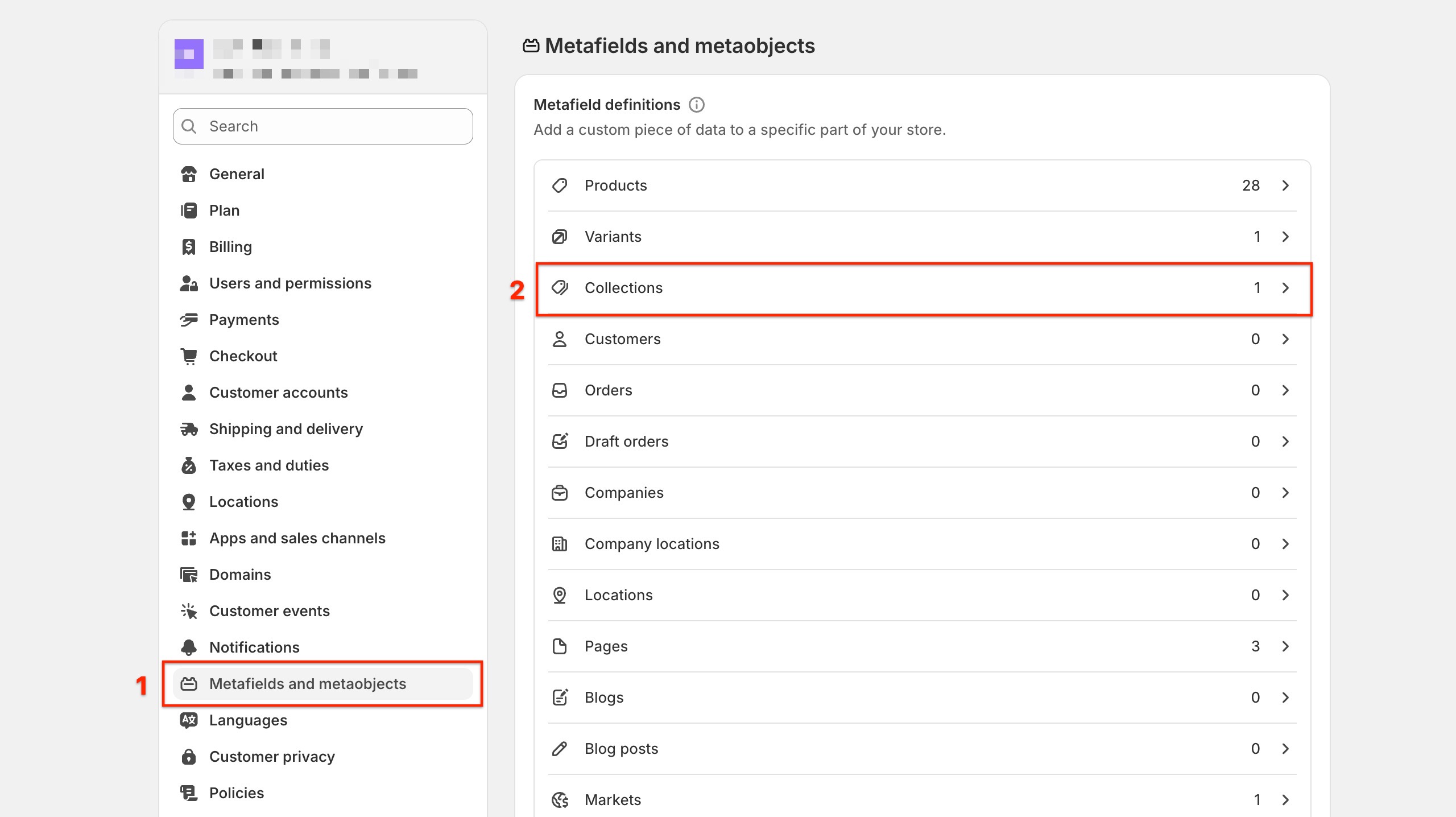 - In the left sidebar, click on Settings (at the bottom) and go to Metafields and metaobjects from the menu.