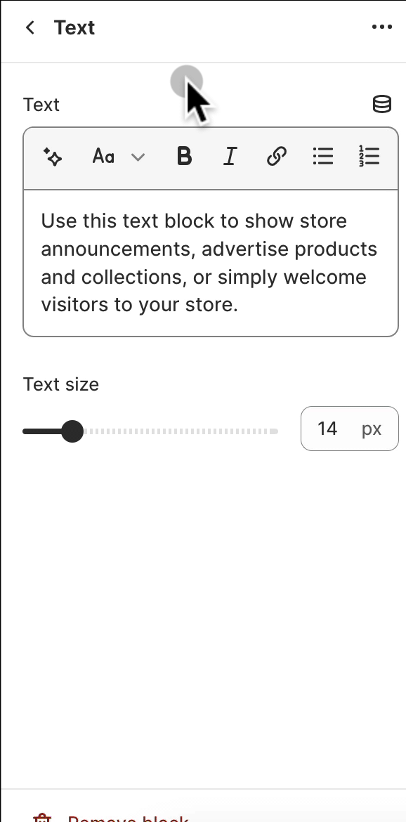 Answer: Certain text - typically body text or description text - can be formatted using the theme's built-in text editor controls. To open links in new tabs, first highlight the text and clickInsert Link, then enable the checkbox to open the link in a new window. This will display the link in a new tab so the customer doesn't navigate away from your store.