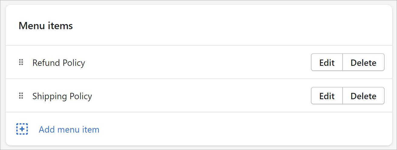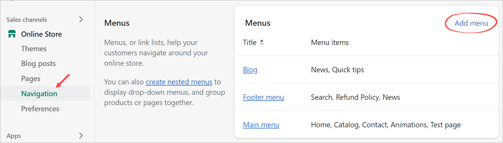 To add a menu to your theme, the menu must first exist within your Shopify admin settings: