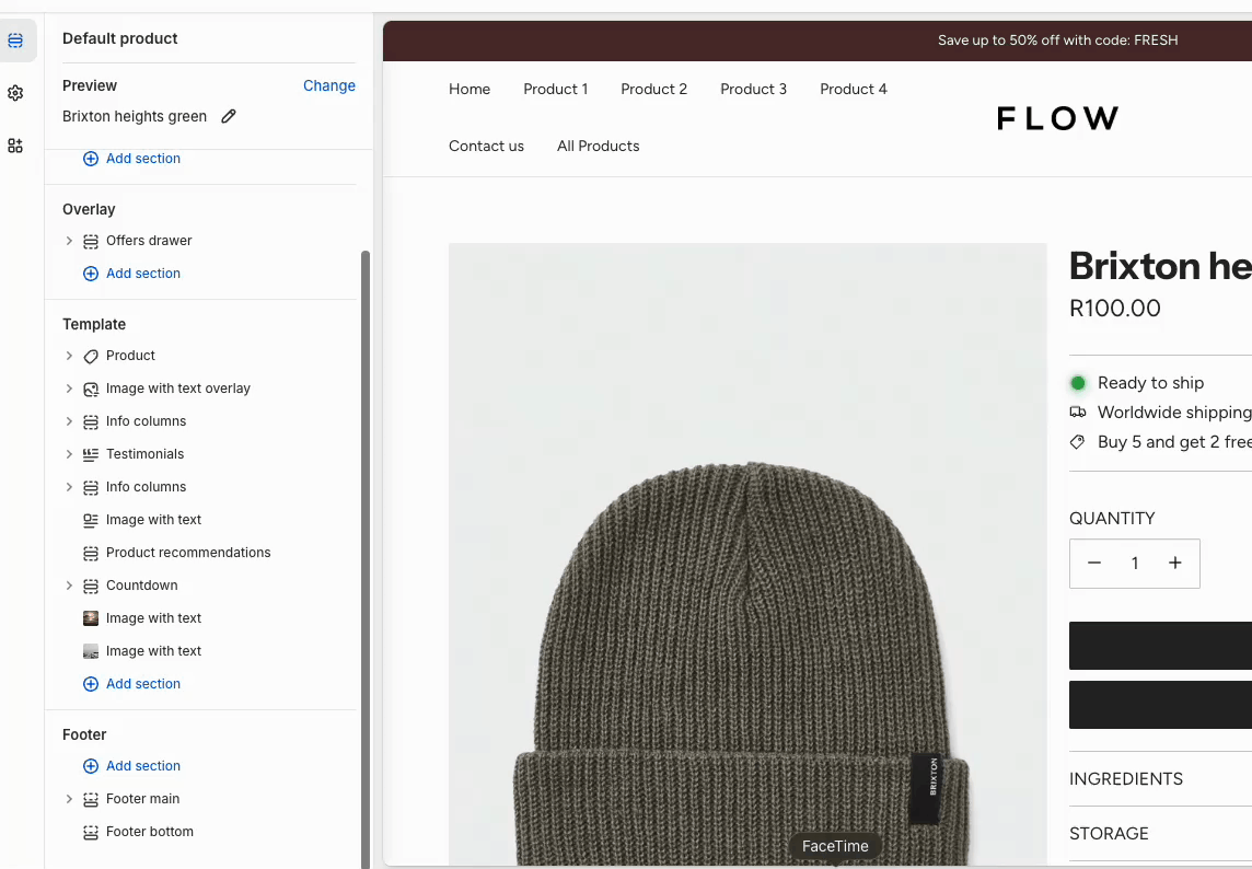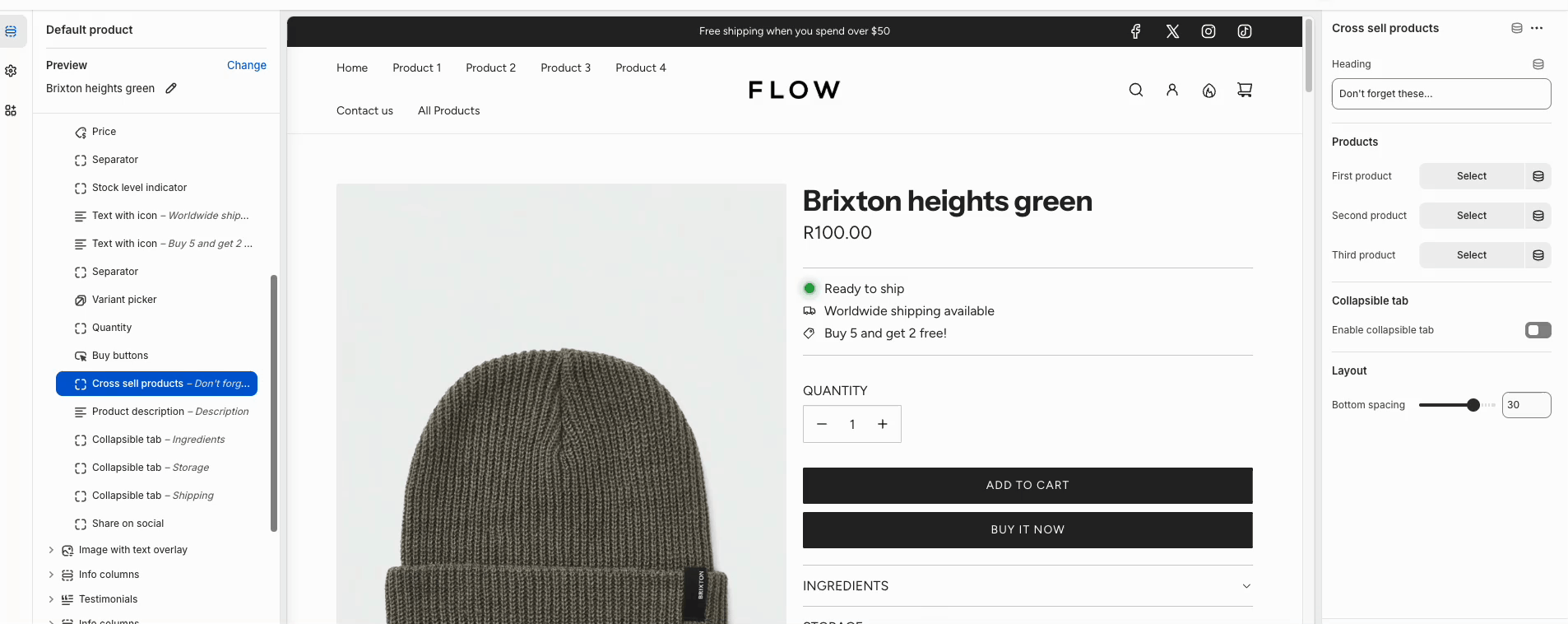 The Cross sells block can be added to the product Section. By using metafields you can promote up to three further products that are relevant to each of your individual products. You can follow our handy guide to set up this block.