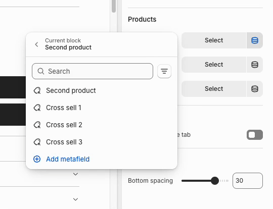 Connect your metafield created in the Cross Sells settings by clicking the discs icon